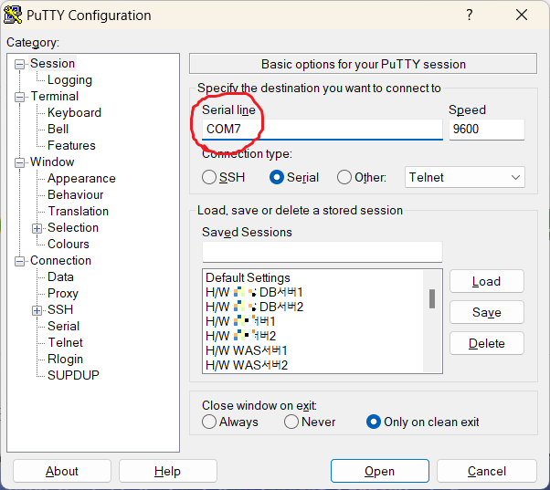 putty에서 연결 타입을 serial로 바꾼 다음에 장치관리자에서 봤던 번호로 COM7 바꿔주면 됩니다.