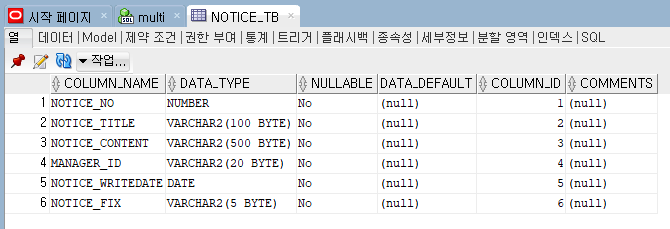 NOTICE_NO는 프라이머리키로 줬고요, NOTICE_TITLE과 NOTICE_CONTENT는 글 내용입니다.